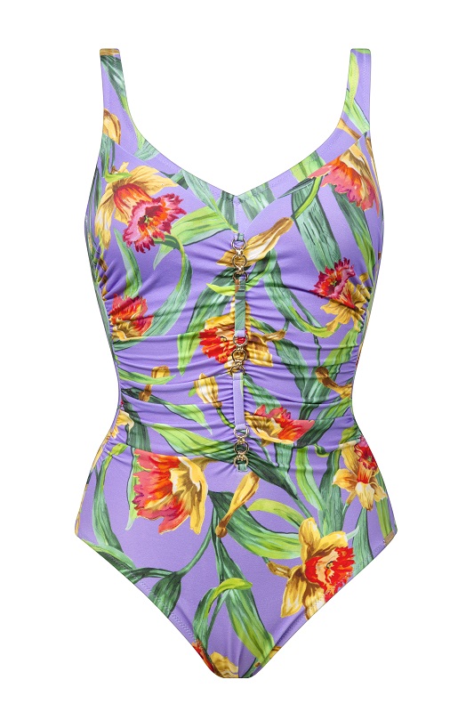 Effetto contenitivo grazie al tessuto tecnico e alle delicate arricciature frontali; il costume offre un effetto shaping che contiene le forme con naturalezza.