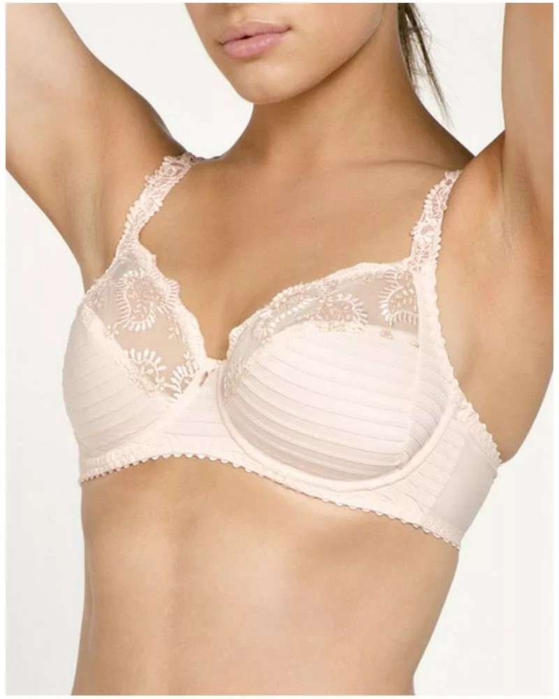 Il reggiseno tre parti grandi coppe della linea Elise è caratterizzato da ricami di foglie dai riflessi perlati abbinati al tulle trasparente nella parte superiore delle coppe.