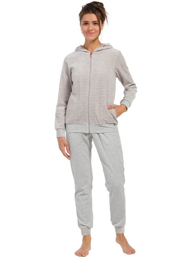 I pantaloni con tasche laterali della tuta da casa hanno la coulisse e hanno i polsini sulle gambe.