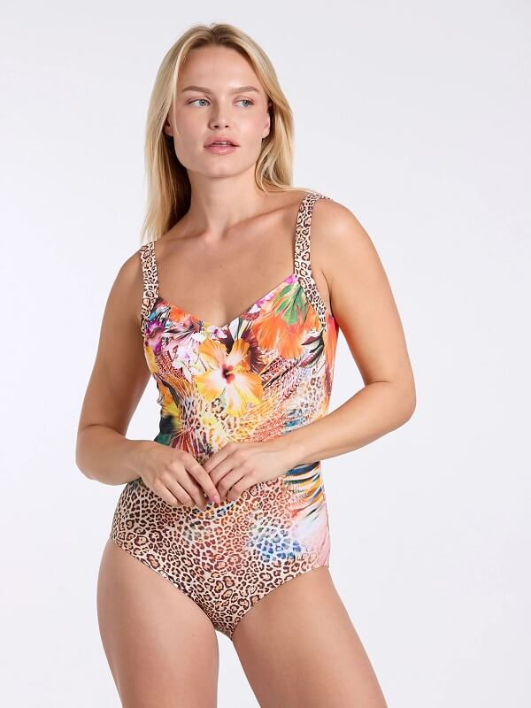 Splendido costume da bagno intero senza feretto con supporto interno al seno e coppe tripartite.Ottimo contenimento del seno grazie alla forma tripartitica ( coppa divisa in tre parti per un sostegno ottimale nelle grandi coppe ) e alla scollatura e alla fascia laterale.